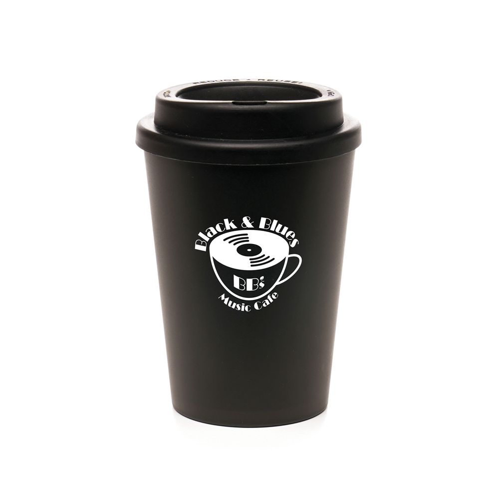 The Haddon Black 350ml double walled take out style coffee mug is an ideal promotional item for displaying your company's branding on the move with PP plastic cup body, lid and silicone ring to secure the lid and keep the lid secure. A perfect giveaway for trade shows, exhibitions and conferences, offering maximum brand visibility and practical use over and over again. Order yours today! BPA & PVC free.