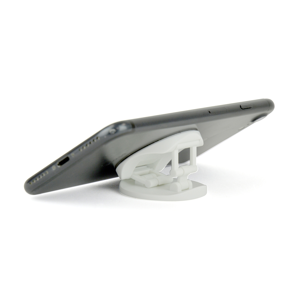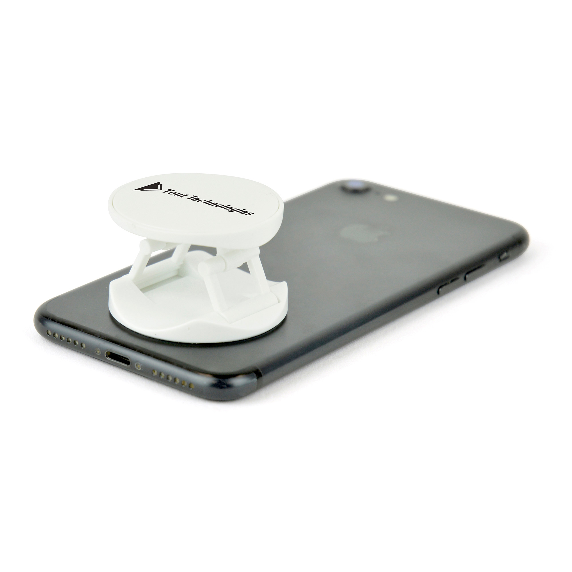 Slim plastic 2-in-1 phone stand and finger grip; simply pull the unit open when in use and fold away neatly after. Available in white.
